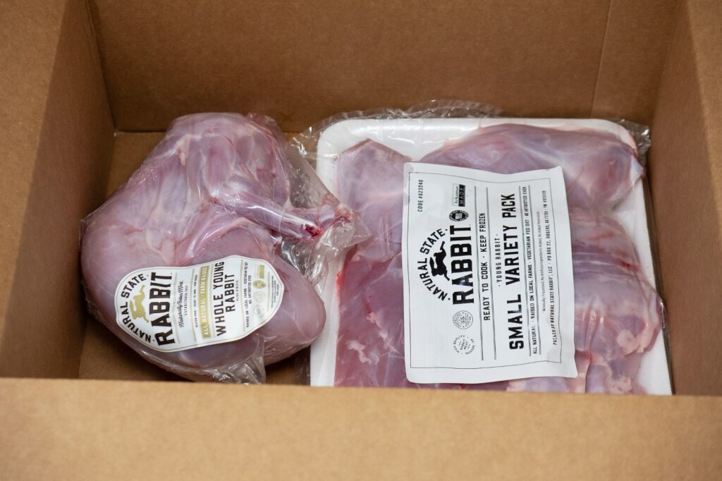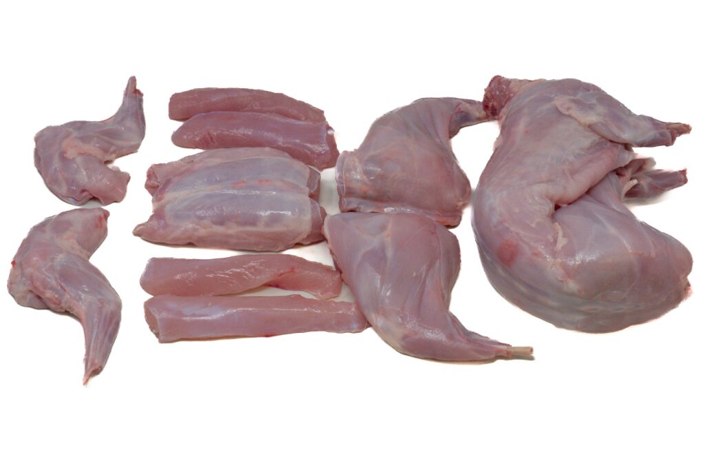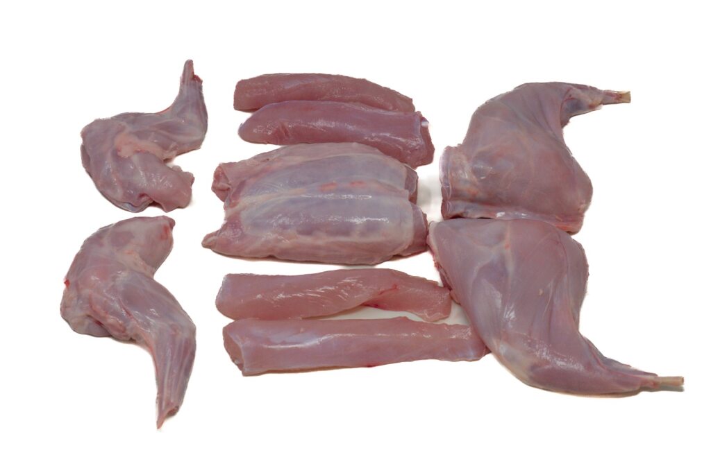 - One whole rabbit, one tray of assorted pieces (wings, boneless saddle, tenderloins, hind legs)